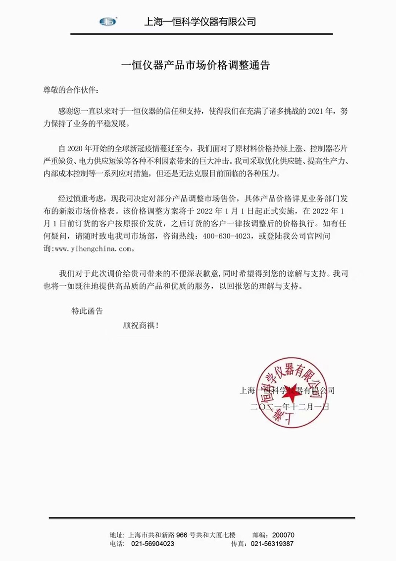 上海一恒調(diào)價(jià)通知將于2022年1月1日正式實(shí)施